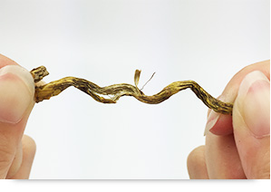 霍山铁皮石斛枫斗,颜色黄绿偏暗棕色,绕环紧密,不易弹开,质硬易折断。